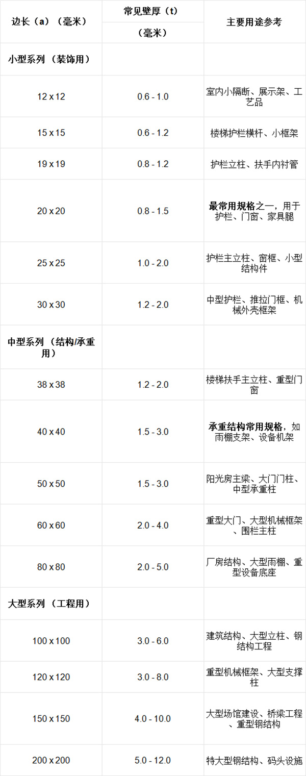 方管的规格通常用 “边长” 来表示,常见的边长范围从很小的12毫米到很大的200毫米不等。壁厚则根据受力需求从0.4毫米到6毫米甚至更厚。